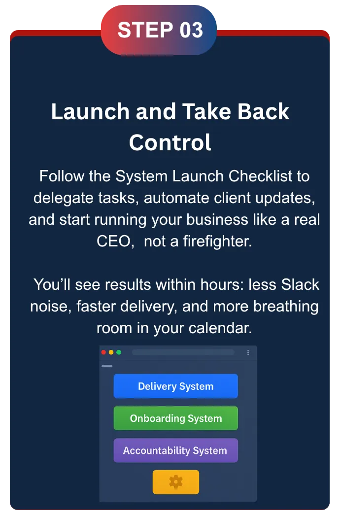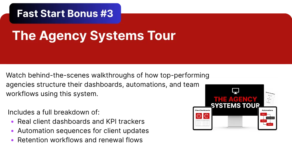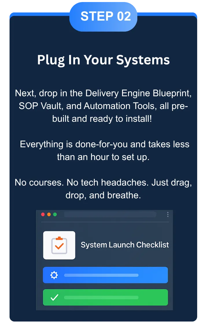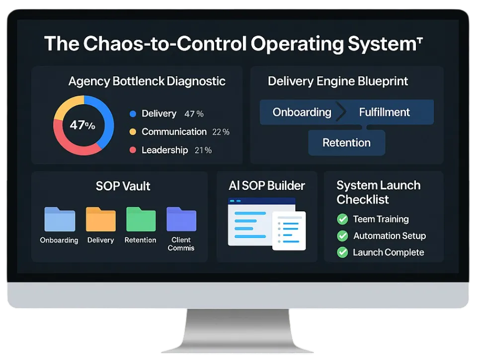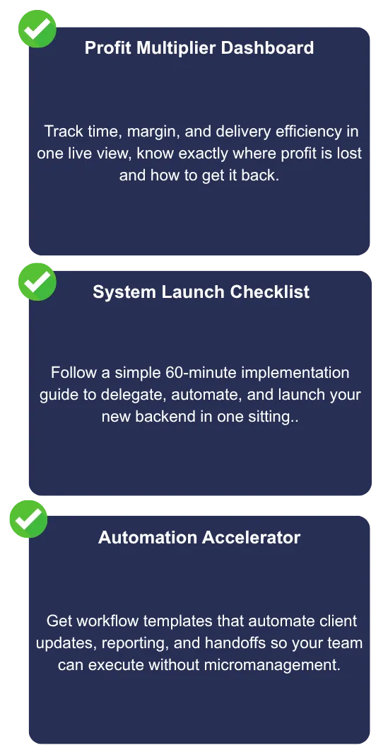 You’ll get a complete plug-and-play backend system, the same one installed inside 50K-200K/month agencies, designed to fix delivery chaos, remove you from daily operations, and increase profit. It includes the tools, SOPs, and automations that streamline onboarding, delivery, and client communication so your agency finally runs smoothly without you. In under 60 minutes, you’ll have clarity, control, and a business that operates like a machine.